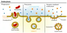 In pinocytosis, a cell takes in ("gulps") extracellular fluid into vesicles, which are formed when plasma membrane surrounds the fluid. The cell can take in any molecule or solute through this process.[2]:139–140