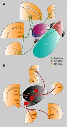 The central nucleus of the amygdala (CeA or aCeN) is a nucleus within the amygdala.[1][2] It "serves as the major output nucleus of the amygdala and participates in receiving and processing pain information."[3][4][5][6]