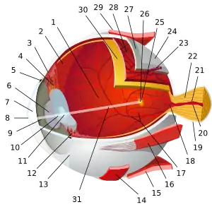 Central retinal vein occlusion, also CRVO, is when the central retinal vein becomes occluded, usually through thrombosis. The central retinal vein is the venous equivalent of the central retinal artery and both may become occluded.[1] Since the central retinal artery and vein are the sole source of blood supply and drainage for the retina, such occlusion can lead to severe damage to the retina and blindness, due to ischemia (restriction in blood supply) and edema (swelling).[2]
