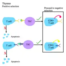 - During positive selection, T cells are checked for their ability to bind peptide-MHC complexes with affinity. If the T cell cannot bind the MHC class I or MHC class II complex, it does not receive survival signals, so it dies via apoptosis. T cell receptors with sufficient affinity for peptide-MHC complexes are selected for survival.