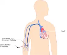 A peripherally inserted central catheter, or PICC line (pronounced "pick"), is a central venous catheter inserted into a vein in the arm (via the basilic or cephalic veins) rather than a vein in the neck or chest. The basilic vein is usually a better target for cannulation than the cephalic vein because it is larger and runs a straighter course through the arm. The tip of the catheter is positioned in the superior vena cava.[1] PICC lines are smaller in diameter than central lines since they are inserted in smaller peripheral veins, and they are much longer than central venous catheters (50–70 cm vs. 15–30 cm). Therefore, the rate of fluid flow through PICC lines is considerably slower than other central lines, rendering them unsuitable for rapid, large volume fluid resuscitation. PICCs can easily occlude and may not be used with phenytoin.[27] PICC lines may also result in venous thrombosis and stenosis, and should therefore be used cautiously in patients with chronic kidney disease in case an arteriovenous fistula might one day need to be created for hemodialysis.[39][40]
