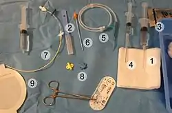 Central lines are used to administer medication or fluids that are unable to be taken by mouth or would harm a smaller peripheral vein, obtain blood tests (specifically the "central venous oxygen saturation"), administer fluid or blood products for large volume resuscitation, and measure central venous pressure.[1][2] The catheters used are commonly 15–30 cm in length, made of silicone or polyurethane, and have single or multiple lumens for infusion.[3]