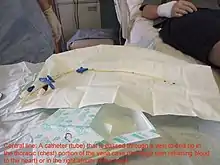 A peripherally inserted central catheter, or PICC line (pronounced "pick"), is a central venous catheter inserted into a vein in the arm (via the basilic or cephalic veins) rather than a vein in the neck or chest. The basilic vein is usually a better target for cannulation than the cephalic vein because it is larger and runs a straighter course through the arm. The tip of the catheter is positioned in the superior vena cava.[1] PICC lines are smaller in diameter than central lines since they are inserted in smaller peripheral veins, and they are much longer than central venous catheters (50–70 cm vs. 15–30 cm). Therefore, the rate of fluid flow through PICC lines is considerably slower than other central lines, rendering them unsuitable for rapid, large volume fluid resuscitation. PICCs can easily occlude and may not be used with phenytoin.[27] PICC lines may also result in venous thrombosis and stenosis, and should therefore be used cautiously in patients with chronic kidney disease in case an arteriovenous fistula might one day need to be created for hemodialysis.[39][40]