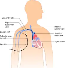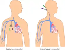 ![]() Diagram showing a non-tunneled central line inserted into the right subclavian vein. | |