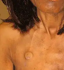 CVCs are a risk factor for forming blood clots (venous thrombosis) including upper extremity deep vein thrombosis.[21][22] It is thought this risk stems from activation of clotting substances in the blood by trauma to the vein during placement.[23] The risk of blood clots is higher in a person with cancer, as cancer is also a risk factor for blood clots. As many as two thirds of cancer patients with central lines show evidence of catheter-associated thrombosis.[3] However, most cases (more than 95%) of catheter-associated thrombosis go undetected. Most symptomatic cases are seen with placement of femoral vein catheters (3.4%) or peripherally inserted central catheters (3%).[3] Anti-clotting drugs such as heparin and fondaparinux have been shown to decrease the incidence of blood clots, specifically deep vein thrombosis, in a person with cancer with central lines.[24] Additionally, studies suggest that short term use of CVCs in the subclavian vein is less likely to be associated with blood clots than CVCs placed in the femoral vein in non-cancer patients.[2]