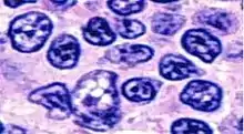 A centrocyte generally refers to a B cell with a cleaved nucleus,[1] as may appear in e.g. follicular lymphoma.[2] Centrocytes are B cells that are found in the light zones of germinal centers. Centrocytes are the non-dividing progeny of Centroblasts, and although they are relatively similar in size, centrocytes lack distinct nucleoli and are more irregularly shaped than centroblasts[3] Centrocytes also express the cell-surface hypermutated B-cell receptor following AID activation. This hypermutated B-cell receptor allows centrocytes to compete for binding of the antigen, internalize it, and then express the processed peptides through their MHC class II receptor.[4] Centrocyte can also refer to a cell with a protoplasm that contains single and double granules of varying size stainable with hematoxylin, as seen in lesions of lichen planus,[1] or a nondividing, activated B cell that expresses membrane immunoglobulin.[1]
