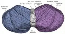 ![]() Schematic representation of the major anatomical subdivisions of the cerebellum. Superior view of an "unrolled" cerebellum, placing the vermis in one plane. | |