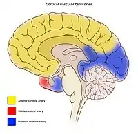 ![]() Areas of the brain are supplied by different arteries. The major systems are divided into an anterior circulation (the anterior cerebral artery and middle cerebral artery) and a posterior circulation | |