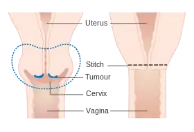 In gynecologic oncology, trachelectomy, also called cervicectomy, is a surgical removal of the uterine cervix.[1] As the uterine body is preserved, this type of surgery is a fertility preserving surgical alternative to a radical hysterectomy and applicable in selected younger women with early cervical cancer.[2]