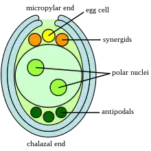 In most flowering plants, the pollen tube enters the ovule through the micropyle opening in the integuments for fertilization (porogamy). In chalazogamous fertilization, the pollen tubes penetrate the ovule through the chalaza rather than the micropyle opening.[2] Chalazogamy was first discovered in monoecious plant species of the family Casuarinaceae by Melchior Treub, but has since then also been observed in others, for example in pistachio and walnut.