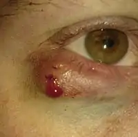 | Symptoms | Red, non painful cyst in middle of the eyelid[2] |