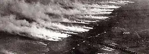 Germany, the first side to employ chemical warfare on the battlefield,[30] simply opened canisters of chlorine upwind of the opposing side and let the prevailing winds do the dissemination. Soon after, the French modified artillery munitions to contain phosgene – a much more effective method that became the principal means of delivery.[31]