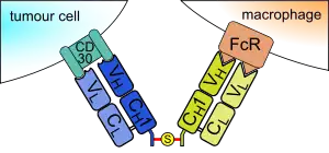 Two chemically linked fragments antigen-binding form an artificial antibody that binds to two different antigens, making it a type of bispecific antibody. They are fragments antigen-binding (Fab or Fab') of two different monoclonal antibodies and are linked by chemical means like a thioether.[1][2] Typically, one of the Fabs binds to a tumour antigen (such as CD30) and the other to a protein on the surface of an immune cell, for example an Fc receptor on a macrophage. In this way, tumour cells are attached to immune cells, which destroy them.[3]