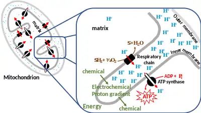 In most cases the proton-motive force is generated by an electron transport chain which acts as a proton pump, using the Gibbs free energy of redox reactions to pump protons (hydrogen ions) out across the membrane, separating the charge across the membrane. In mitochondria, energy released by the electron transport chain is used to move protons from the mitochondrial matrix (N side) to the intermembrane space (P side). Moving the protons out of the mitochondrion creates a lower concentration of positively charged protons inside it, resulting in excess negative charge on the inside of the membrane. The electrical potential gradient is about -170 mV [6], negative inside (N). These gradients - charge difference and the proton concentration difference both create a combined electrochemical gradient across the membrane, often expressed as the proton-motive force (PMF). In mitochondria, the PMF is almost entirely made up of the electrical component but in chloroplasts the PMF is made up mostly of the pH gradient because the charge of protons H+ is neutralized by the movement of Cl− and other anions. In either case, the PMF needs to be greater than about 460 mV (45 kJ/mol) for the ATP synthase to be able to make ATP.