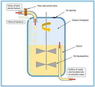 ![]() A chemostat diagram featuring inflow (feed) and outflow (effluent). | |