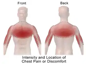 Chest pain is pain or discomfort in the chest, typically the front of the chest.[1] It may be described as sharp, dull, pressure, heaviness or squeezing.[3] Associated symptoms may include pain in the shoulder, arm, upper abdomen, or jaw, along with nausea, sweating, or shortness of breath.[1][3] It can be divided into heart-related and non-heart-related pain.[1][2] Pain due to insufficient blood flow to the heart is also called angina pectoris.[5] Those with diabetes or the elderly may have less clear symptoms.[3]