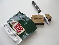 Plug chewing tobacco is tobacco leaves pressed into a square, brick-like mass called a plug. From this, pieces are bitten off or cut from the plug and then chewed. Plug tobacco is declining in popularity, thus less readily available than loose-leaf chewing tobacco. Historically, plug tobacco could be either smoked in a pipe or chewed, but today, these are two distinct products.