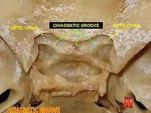 The superior surface of the body of the sphenoid bone is bounded behind by a ridge, which forms the anterior border of a narrow, transverse groove, the chiasmatic groove (optic groove, prechiasmatic sulcus), above and behind which lies the optic chiasma of cranial nerve 2 (the optic nerve).
