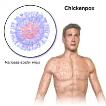 Chickenpox, or chicken pox, also known as varicella, is a highly contagious, vaccine-preventable disease caused by the initial infection with varicella zoster virus (VZV), a member of the herpesvirus family.[3][5] The disease results in a characteristic skin rash that forms small, itchy blisters, which eventually scab over.[1] It usually starts on the chest, back, and face.[1] It then spreads to the rest of the body.[1] The rash and other symptoms, such as fever, tiredness, and headaches, usually last five to seven days.[1] Complications may occasionally include pneumonia, inflammation of the brain, and bacterial skin infections.[7] The disease is usually more severe in adults than in children.[8]