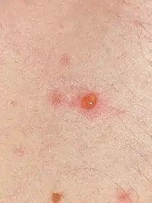 The early (prodromal) symptoms in adolescents and adults are nausea, loss of appetite, aching muscles, and headache.[16] This is followed by the characteristic rash or oral sores, malaise, and a low-grade fever that signal the presence of the disease. Oral manifestations of the disease (enanthem) not uncommonly may precede the external rash (exanthem). In children the illness is not usually preceded by prodromal symptoms, and the first sign is the rash or the spots in the oral cavity. The rash begins as small red dots on the face, scalp, torso, upper arms and legs; progressing over 10–12 hours to small bumps, blisters and pustules; followed by umbilication and the formation of scabs.[17][18]