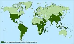 Historically, chikungunya has been present mostly in the developing world. The disease causes an estimated 3 million infections each year.[59] Epidemics in the Indian Ocean, Pacific Islands, and in the Americas, continue to change the distribution of the disease.[60] In Africa, chikungunya is spread by a sylvatic cycle in which the virus largely cycles between other non-human primates, small mammals, and mosquitos between human outbreaks.[61] During outbreaks, due to the high concentration of virus in the blood of those in the acute phase of infection, the virus can circulate from humans to mosquitoes and back to humans.[61] The transmission of the pathogen between humans and mosquitoes that exist in urban environments was established on multiple occasions from strains occurring on the eastern half of Africa in non-human primate hosts.[37] This emergence and spread beyond Africa may have started as early as the 18th century.[37] Currently, available data does not indicate whether the introduction of chikungunya into Asia occurred in the 19th century or more recently, but this epidemic Asian strain causes outbreaks in India and continues to circulate in Southeast Asia.[37] In Africa, outbreaks were typically tied to heavy rainfall causing increased mosquito population. In recent outbreaks in urban centers, the virus has spread by circulating between humans and mosquitoes.[13]