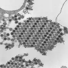 The virus consists of four nonstructural proteins and three structural proteins.[37] The structural proteins are the capsid and two envelope glycoproteins: E1 and E2, which form heterodimeric spikes on the viron surface. E2 binds to cellular receptors in order to enter the host cell through receptor-mediated endocytosis. E1 contains a fusion peptide which, when exposed to the acidity of the endosome in eukaryotic cells, dissociates from E2 and initiates membrane fusion that allows the release of nucleocapsids into the host cytoplasm, promoting infection.[39] The mature virion contains 240 heterodimeric spikes of E2/E1, which after release, bud on the surface of the infected cell, where they are released by exocytosis to infect other cells.[17]