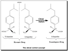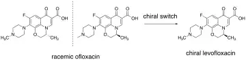 A chiral switch is a chiral drug that has already approved as racemate but has been re-developed as a single enantiomer.[1][2] The term chiral switching was introduced by Agranat and Caner in 1999[3] to describe the development of single enantiomers from racemate drugs. For example, levofloxacin is a chiral switch of racemic ofloxacin. The essential principle of a chiral switch is that there is a change in the status of chirality.[4] In general, the term chiral switch is preferred over racemic switch because the switch is usually happening from a racemic drug to the corresponding single enantiomer(s). It is important to understand that chiral switches are treated as a selection invention.[3] A selection invention is an invention that selects a group of new members from a previously known class on the basis of superior properties.[5] To express the pharmacological activities of each of the chiral twins of a racemic drug two technical terms have been coined eutomer and distomer.[6][7] The member of the chiral twin that has greater physiological activity is referred to as the eutomer and the other one with lesser activity is referred to as distomer. The eutomer/distomer ratio is called the eudisimic ratio and reflects the degree of enantioselectivity of the biological activity.[8]