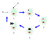 Chlamydia pneumoniae is a small gram-negative bacterium (0.2 to 1 μm) that undergoes several transformations during its life cycle. It exists as an elementary body (EB) between hosts. The EB is not biologically active, but is resistant to environmental stresses and can survive outside a host for a limited time. The EB travels from an infected person to the lungs of an uninfected person in small droplets and is responsible for infection. Once in the lungs, the EB is taken up by cells in a pouch called an endosome by a process called phagocytosis. However, the EB is not destroyed by fusion with lysosomes, as is typical for phagocytosed material. Instead, it transforms into a reticulate body (RB) and begins to replicate within the endosome. The reticulate bodies must use some of the host's cellular metabolism to complete its replication. The reticulate bodies then convert back to elementary bodies and are released back into the lung, often after causing the death of the host cell. The EBs are thereafter able to infect new cells, either in the same organism or in a new host. Thus, the lifecycle of C. pneumoniae is divided between the elementary body, which is able to infect new hosts but cannot replicate, and the reticulate body, which replicates but is not able to cause a new infection.[9]