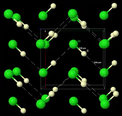At room temperature, hydrogen chloride is a colourless gas, like all the hydrogen halides apart from hydrogen fluoride, since hydrogen cannot form strong hydrogen bonds to the larger electronegative chlorine atom; however, weak hydrogen bonding is present in solid crystalline hydrogen chloride at low temperatures, similar to the hydrogen fluoride structure, before disorder begins to prevail as the temperature is raised.[42] Hydrochloric acid is a strong acid (pKa = −7) because the hydrogen bonds to chlorine are too weak to inhibit dissociation. The HCl/H2O system has many hydrates HCl·nH2O for n = 1, 2, 3, 4, and 6. Beyond a 1:1 mixture of HCl and H2O, the system separates completely into two separate liquid phases. Hydrochloric acid forms an azeotrope with boiling point 108.58 °C at 20.22 g HCl per 100 g solution; thus hydrochloric acid cannot be concentrated beyond this point by distillation.[43]