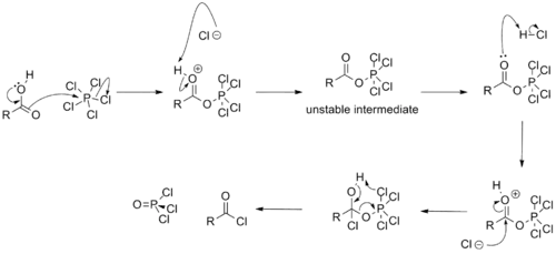 - Ph3SnCl + HCl ⟶ Ph2SnCl2 + PhH (solvolysis)
