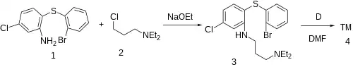 Thus alkylation of 2-(2-bromo-phenylsulfanyl)-5-chloro-aniline [105790-02-1] (1) with 3-chloro-1-diethylaminopropane [104-77-8] (2) leads to the intermediate (3). Ring closure as above by nucleophilic aromatic displacement leads to the antipsychotic drug chlorproethazine (4).