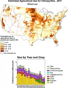 EPA estimated that, between 1987 and 1998, about 21 million pounds of chlorpyrifos were used annually in the US.[23] In 2001, chlorpyrifos ranked 15th among pesticides used in the United States, with an estimated 8 to 11 million pounds applied. In 2007, it ranked 14th among pesticide ingredients used in agriculture in the United States.[24]