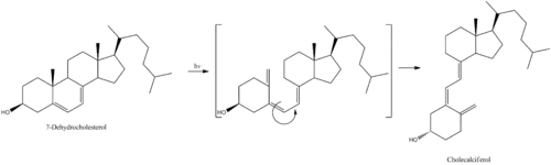 7-Dehydrocholesterol is the precursor of cholecalciferol.[2] Within the epidermal layer of skin, 7-dehydrocholesterol undergoes an electrocyclic reaction as a result of UVB light at wavelengths between 290 and 315 nm, with peak synthesis occurring between 295 and 300 nm.[38] This results in the opening of the vitamin precursor B-ring through a conrotatory pathway making previtamin D3 (pre-cholecalciferol).[39] In a process which is independent of UV light, the pre-cholecalciferol then undergoes a [1,7] antarafacial sigmatropic rearrangement [40] and therein finally isomerizes to form vitamin D3.