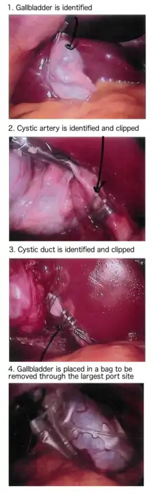 As of 2008, 90% of cholecystectomies in the United States were done laparoscopically.[41] Laparoscopic surgery is thought to have fewer complications, shorter hospital stay, and quicker recovery than open cholecystectomy.[42]