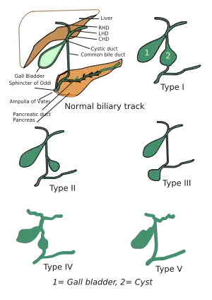 Choledochal cysts (a.k.a. bile duct cyst) are congenital conditions involving cystic dilatation of bile ducts.[1] They are uncommon in western countries[2] but not as rare in East Asian nations like Japan and China.
