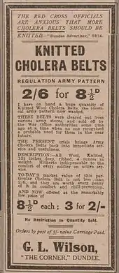 In 1914, donations by the tiny village of Middlemarch, New Zealand of items such as tobacco, shirts and tinned fruit for soldiers going to fight in World War I, included "26 cholera belts".[4] The idea of abdominal chilling as a factor in illness was brought up as late as 1947 although it was rejoined by those who pointed out that the idea was not based on experimental evidence.[5]