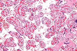 - De La Ossa, MM.; Cabello-Inchausti, B.; Robinson, MJ. (Sep 2001). "Placental chorangiosis". Arch Pathol Lab Med. 125 (9): 1258. doi:10.5858/2001-125-1258-PC. PMID 11520290.
