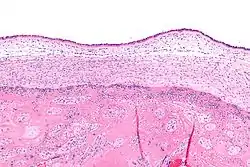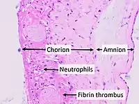 | Micrograph showing acute chorioamnionitis, with neutrophils in the chorion. Also seen are fibrin thrombi, which indicate a severe fetal inflammatory response.[1] H&E stain. | |