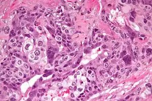 | Micrograph of choriocarcinoma showing both of the components necessary for the diagnosis - cytotrophoblasts and syncytiotrophoblasts. The syncytiotrophoblasts are multinucleated and have a dark staining cytoplasm. The cytotrophoblasts are mononuclear and have a pale staining cytoplasm. H&E stain. | |