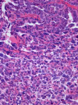 | Photomicrograph of hematoxylin-eosin stained section of a choroid plexus carcinoma (grade III WHO) at 400x magnification. | |
