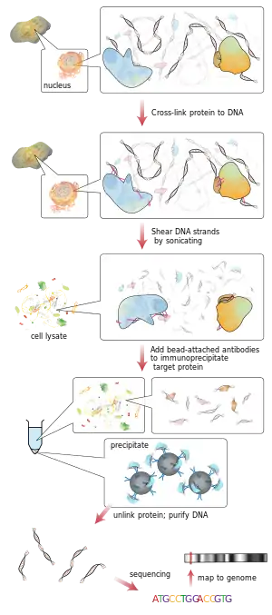 Chromatin immunoprecipitation (ChIP) is a type of immunoprecipitation experimental technique used to investigate the interaction between proteins and DNA in the cell. It aims to determine whether specific proteins are associated with specific genomic regions, such as transcription factors on promoters or other DNA binding sites, and possibly define cistromes. ChIP also aims to determine the specific location in the genome that various histone modifications are associated with, indicating the target of the histone modifiers.[1] ChIP is crucial for the advancements in the field of epigenomics and learning more about epigenetic phenomena.[2]
