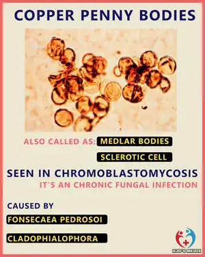 The most informative test is to scrape the lesion and add potassium hydroxide (KOH), then examine under a microscope. (KOH scrapings are commonly used to examine fungal infections.) The pathognomonic finding is observing medlar bodies (also called muriform bodies or sclerotic cells). Scrapings from the lesion can also be cultured to identify the organism involved. Blood tests and imaging studies are not commonly used. On histology, chromoblastomycosis manifests as pigmented yeasts resembling "copper pennies". Special stains, such as periodic acid schiff and Gömöri methenamine silver, can be used to demonstrate the fungal organisms if needed.