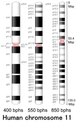 G-banding patterns of human chromosome 11 in three different resolutions (400,[13] 550[14] and 850[2]). Band length in this diagram is based on the ideograms from ISCN (2013).[15] This type of ideogram represents actual relative band length observed under a microscope at the different moments during the mitotic process.[16]