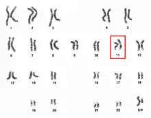 Chromosome 11 is one of the 23 pairs of chromosomes in humans. Humans normally have two copies of this chromosome. Chromosome 11 spans about 135 million base pairs (the building material of DNA) and represents between 4 and 4.5 percent of the total DNA in cells. The shorter arm (p arm) is termed 11p while the longer arm (q arm) is 11q. At about 21.5 genes per megabase, chromosome 11 is one of the most gene-rich, and disease-rich, chromosomes in the human genome.