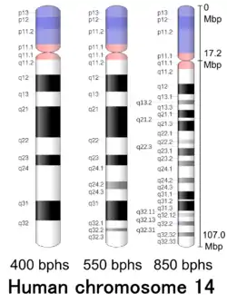 G-banding patterns of human chromosome 14 in three different resolutions (400,[12] 550[13] and 850[3]). Band length in this diagram is based on the ideograms from ISCN (2013).[14] This type of ideogram represents actual relative band length observed under a microscope at the different moments during the mitotic process.[15]