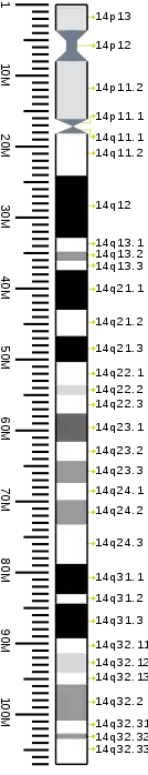 • Heilig R, Eckenberg R, Petit JL, Fonknechten N, Da Silva C, Cattolico L, Levy M, Barbe V, de Berardinis V, Ureta-Vidal A, Pelletier E, Vico V, Anthouard V, Rowen L, Madan A, Qin S, Sun H, Du H, Pepin K, Artiguenave F, Robert C, Cruaud C, Bruls T, Jaillon O, Friedlander L, Samson G, Brottier P, Cure S, Segurens B, Aniere F, Samain S, Crespeau H, Abbasi N, Aiach N, Boscus D, Dickhoff R, Dors M, Dubois I, Friedman C, Gouyvenoux M, James R, Madan A, Mairey-Estrada B, Mangenot S, Martins N, Menard M, Oztas S, Ratcliffe A, Shaffer T, Trask B, Vacherie B, Bellemere C, Belser C, Besnard-Gonnet M, Bartol-Mavel D, Boutard M, Briez-Silla S, Combette S, Dufosse-Laurent V, Ferron C, Lechaplais C, Louesse C, Muselet D, Magdelenat G, Pateau E, Petit E, Sirvain-Trukniewicz P, Trybou A, Vega-Czarny N, Bataille E, Bluet E, Bordelais I, Dubois M, Dumont C, Guerin T, Haffray S, Hammadi R, Muanga J, Pellouin V, Robert D, Wunderle E, Gauguet G, Roy A, Sainte-Marthe L, Verdier J, Verdier-Discala C, Hillier L, Fulton L, McPherson J, Matsuda F, Wilson R, Scarpelli C, Gyapay G, Wincker P, Saurin W, Quetier F, Waterston R, Hood L, Weissenbach J (2003). "The DNA sequence and analysis of human chromosome 14". Nature. 421 (6923): 601–7. Bibcode:2003Natur.421..601H. doi:10.1038/nature01348. PMID 12508121.