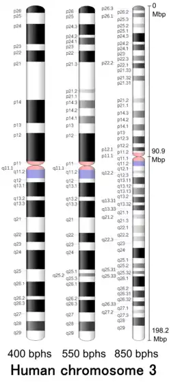 - "Chromosome 3: Chromosome summary – Homo sapiens". Ensembl Release 88. 2017-03-29. Retrieved 2017-05-19.