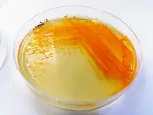 Chryseobacterium is a genus of Gram-negative bacteria. Chryseobacterium species are chemoorganotrophic, rod shape gram-negative bacteria. Chryseobacterium form typical yellow-orange color colonies due to flexirubin-type pigment. The genus contains more than 100 described species from diverse habitats, including freshwater sources, soil, marine fish, and human hosts.[2]