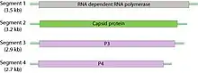 The capsid is about 35-40 nm in diameter. The genome has four segments (tetrapartite). These segments are separately encapsulated.[4]