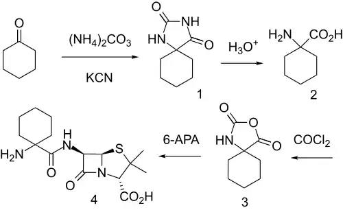 Reaction of cyclohexanone with ammonium carbonate and KCN under the conditions of the Bucherer-Bergs reaction led to hydantoin 1. On acid hydrolysis, α-amino acid 2 resulted. Treatment with phosgene both protected the amino group and activated the carboxyl group toward amide formation (as 3) and reaction with 6-aminopenicillanic acid (6-APA) gave cyclacillin (4).